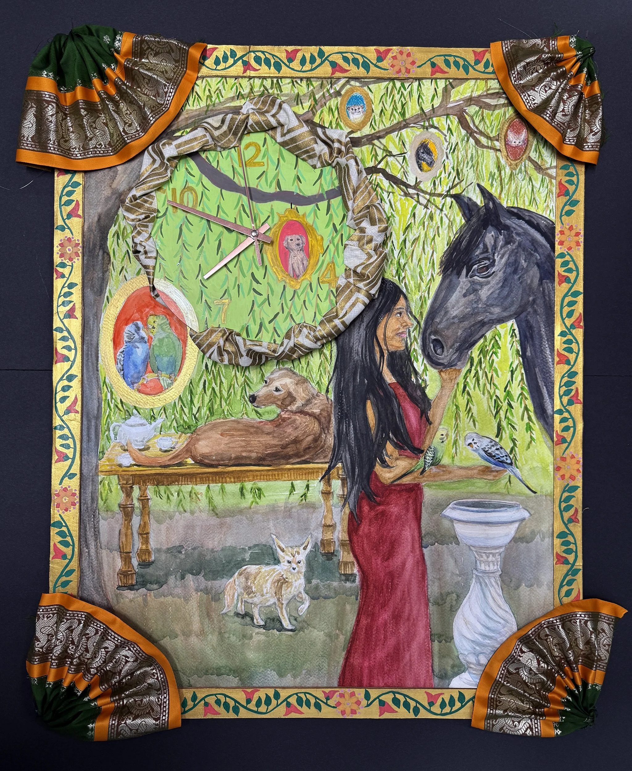 Being a high school student, I'm constantly stressed and am always looking for a way to run from it. I have been an animal lover throughout my whole life. Being with animals is a way to escape the stressors in my life, and I've always had a love for them. When I'm in nature, I feel a sense of relaxation pouring over me. In this picture, my favorite animals, birds, dogs, horses, and fennec foxes are reflected. The birds in the painting are my pet birds, and the dog is my grandparents' dog in India. The frames symbolize picturing animals when I'm not around them, or when I need an escape from my daily activities, I often envision myself surrounded by them. The clock in the corner represents two things: me losing track of time when I'm with animals, and the timeless joy they bring me. As long as I'm surrounded by nature and animals, I will be grateful. I also used an Indian-designed cloth to show my connection to my culture.